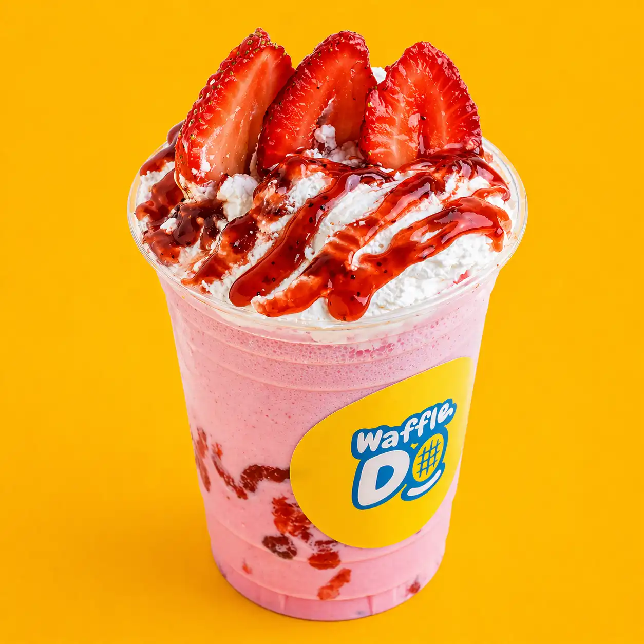 Helado de fresa, leche,crema batida y mermelada de fresa.