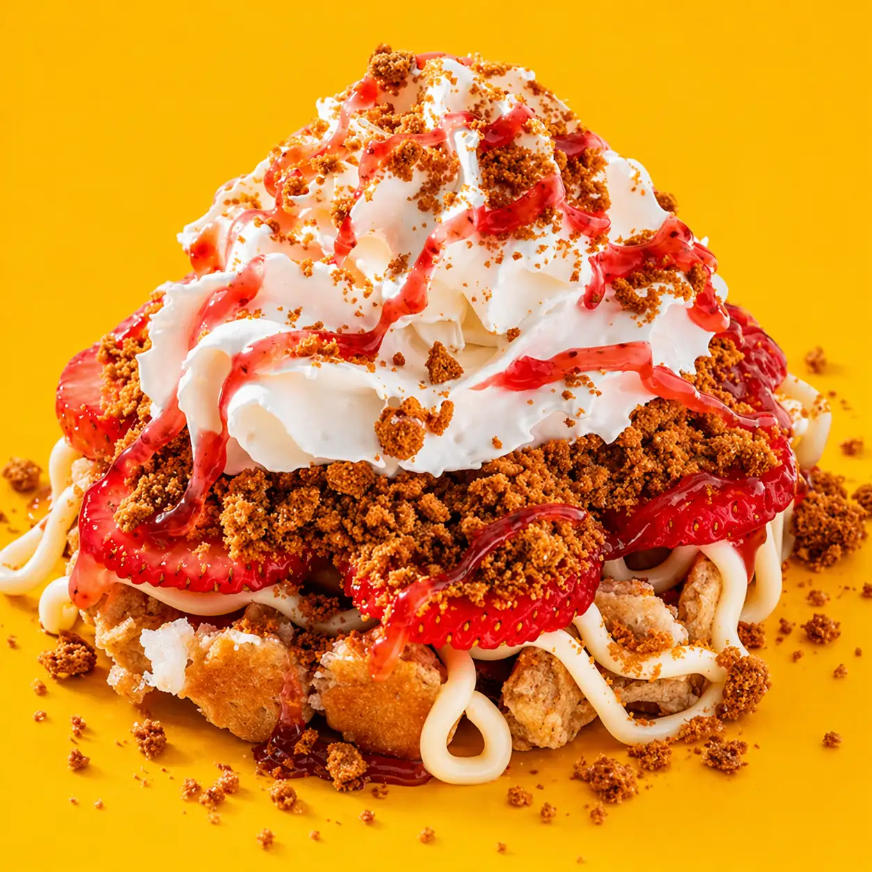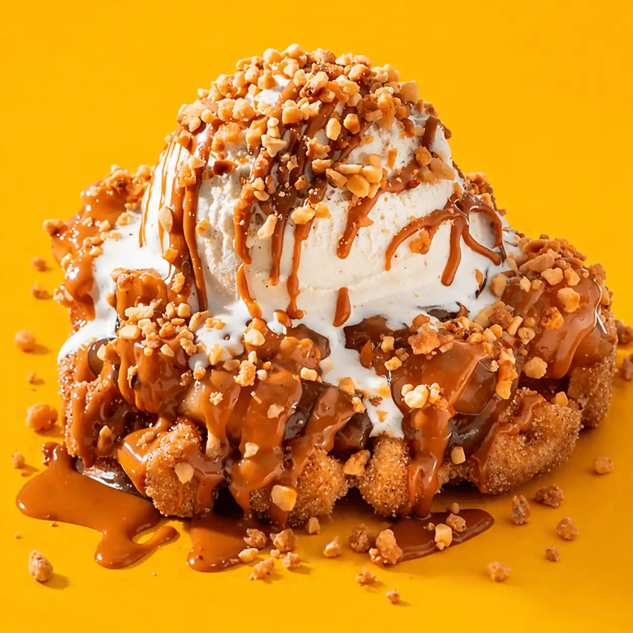 Churro waffle, apple pie filling, crumb de galletas Biscoff, crema de Biscoff