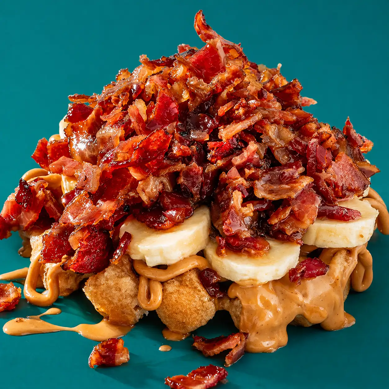Mantequilla de maní, guineo, bacon bits, Maple Syrup.